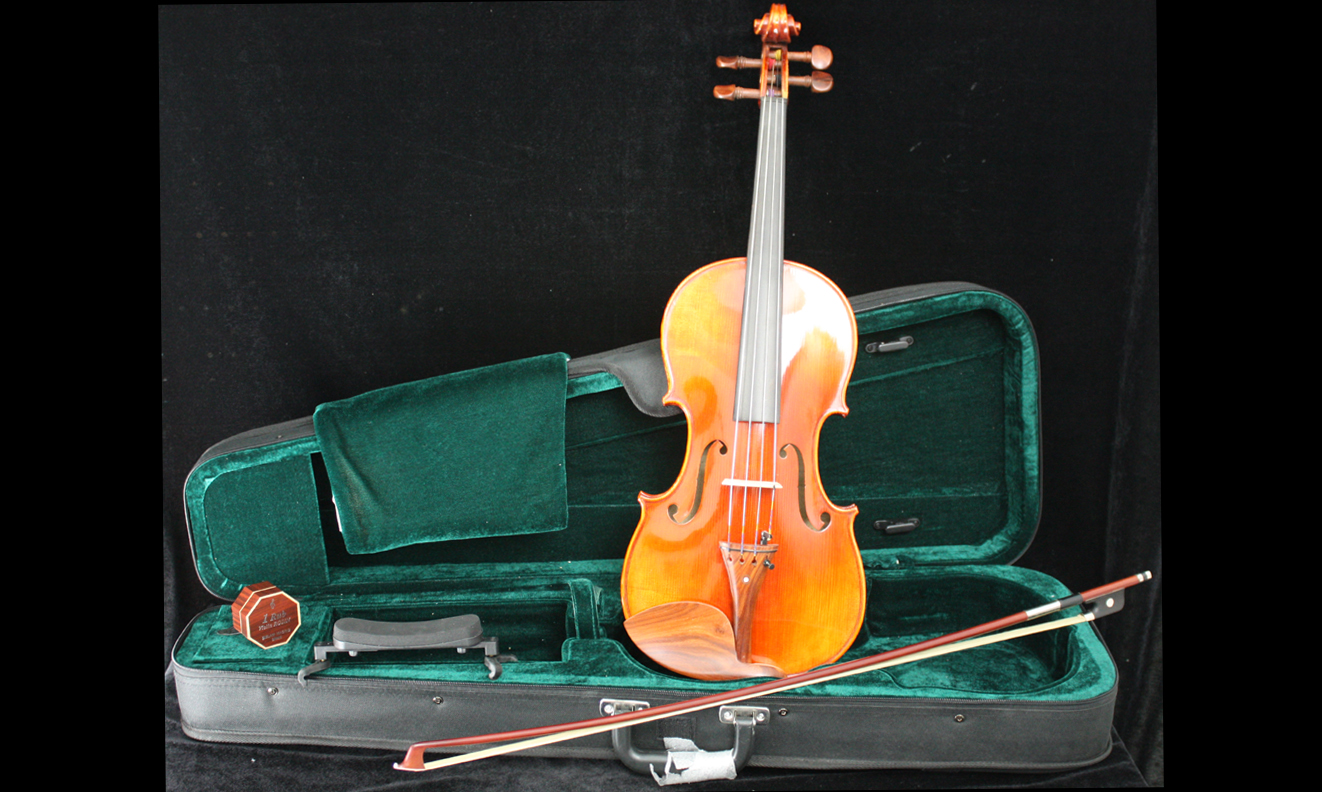 Slightly flamed one or two-piece maple back and selected grained spruce top. Very fine workmanship at a friendly price. Professionally set up at ready to play condition. Come with oblong foam case and Brazilwood bow. Composite Bow additional $50